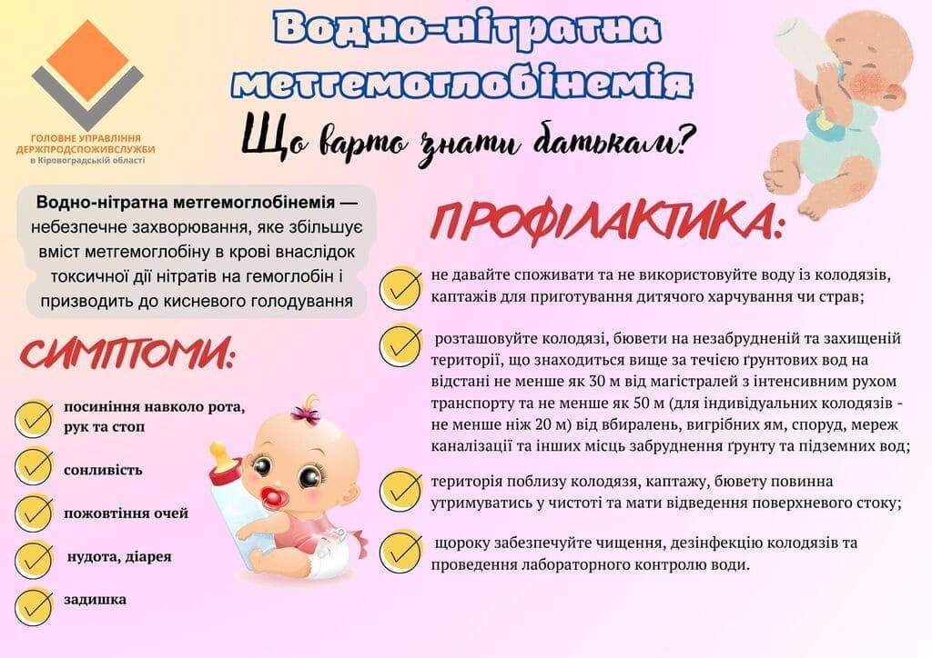 22 жовтня 2025 року в одному з сіл Новоукраїнського району Кіровоградської області зафіксовано випадок метгемоглобінемії у однорічної дитини. Наразі маля перебуває у стані середньої важкості в закладі охорони здоров’я. В області проводять епідеміологічне розслідування та лабораторне дослідження колодязної води.Це перший випадок метгемоглобінемії на Кіровоградщині у 2025 році. Попередній зафіксували у 2023-му — тоді захворіла чотиримісячна дитина в одному з сіл Онуфріївської громади Олександрійського району.